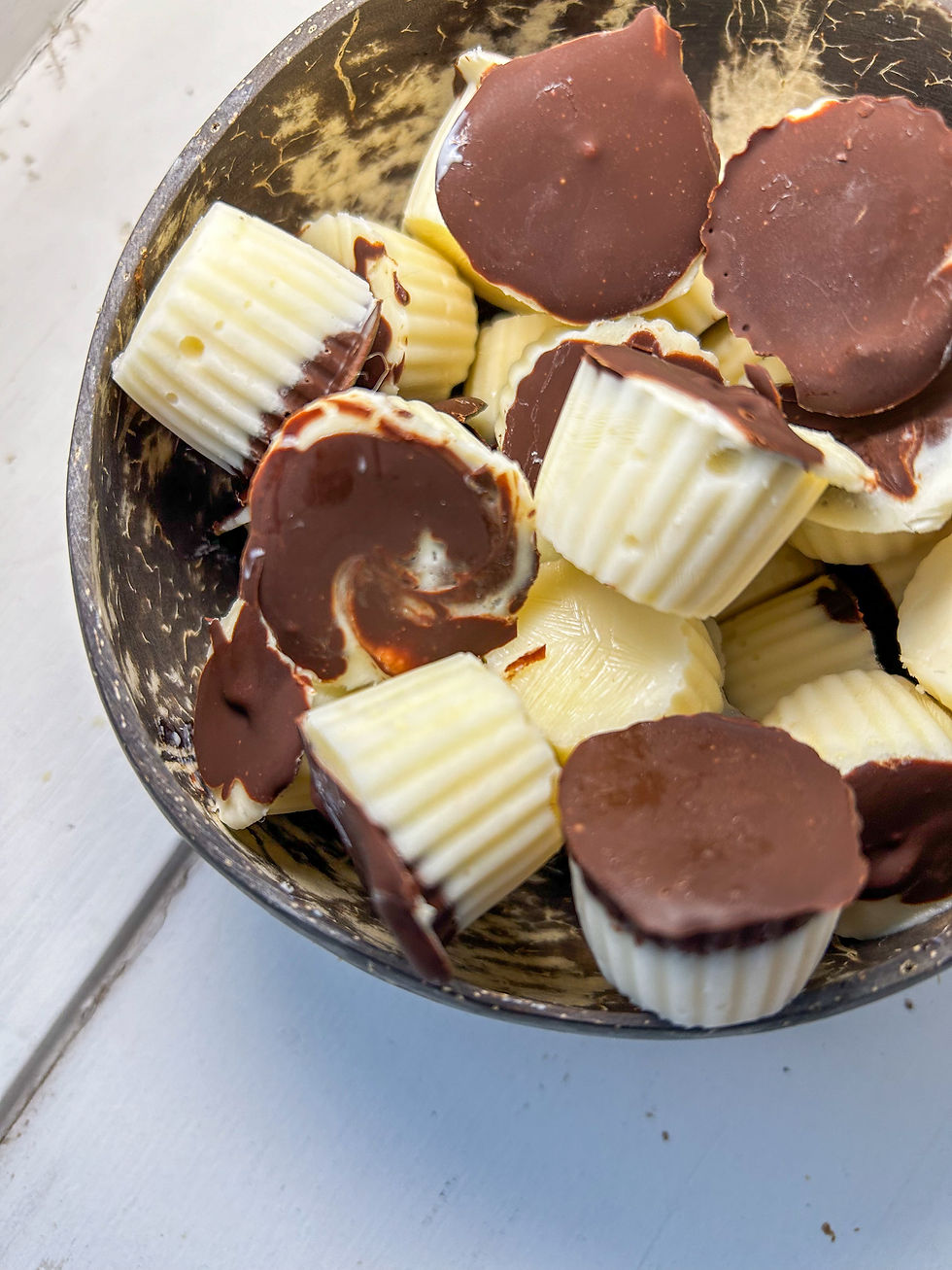 In a bowl mix together greek yogurt, vanilla, orange juice and maple syrup. Pour into moulds. Melt chocolate and drizzle on top. Freeze until you are ready to enjoy :)
